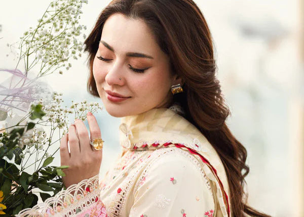 QALAMKAR -OFF WHITE 3PC LAWN EMBROIDERED SHIRT WITH ORGANZA CUTWORK EMBROIDERED DUPATTA AND TROUSER V455